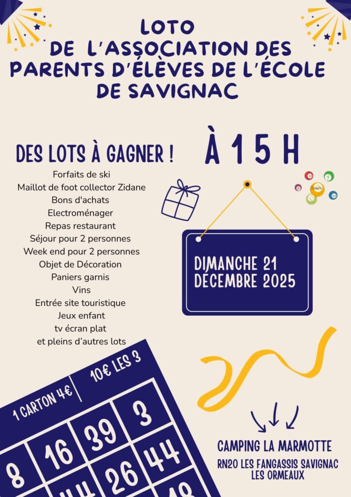L’association des Parents d’élèves de l’école de Savignac vous invite à son loto qui aura lieu le dimanche 21 décembre 2025 à 15h00, au camping la Marmotte